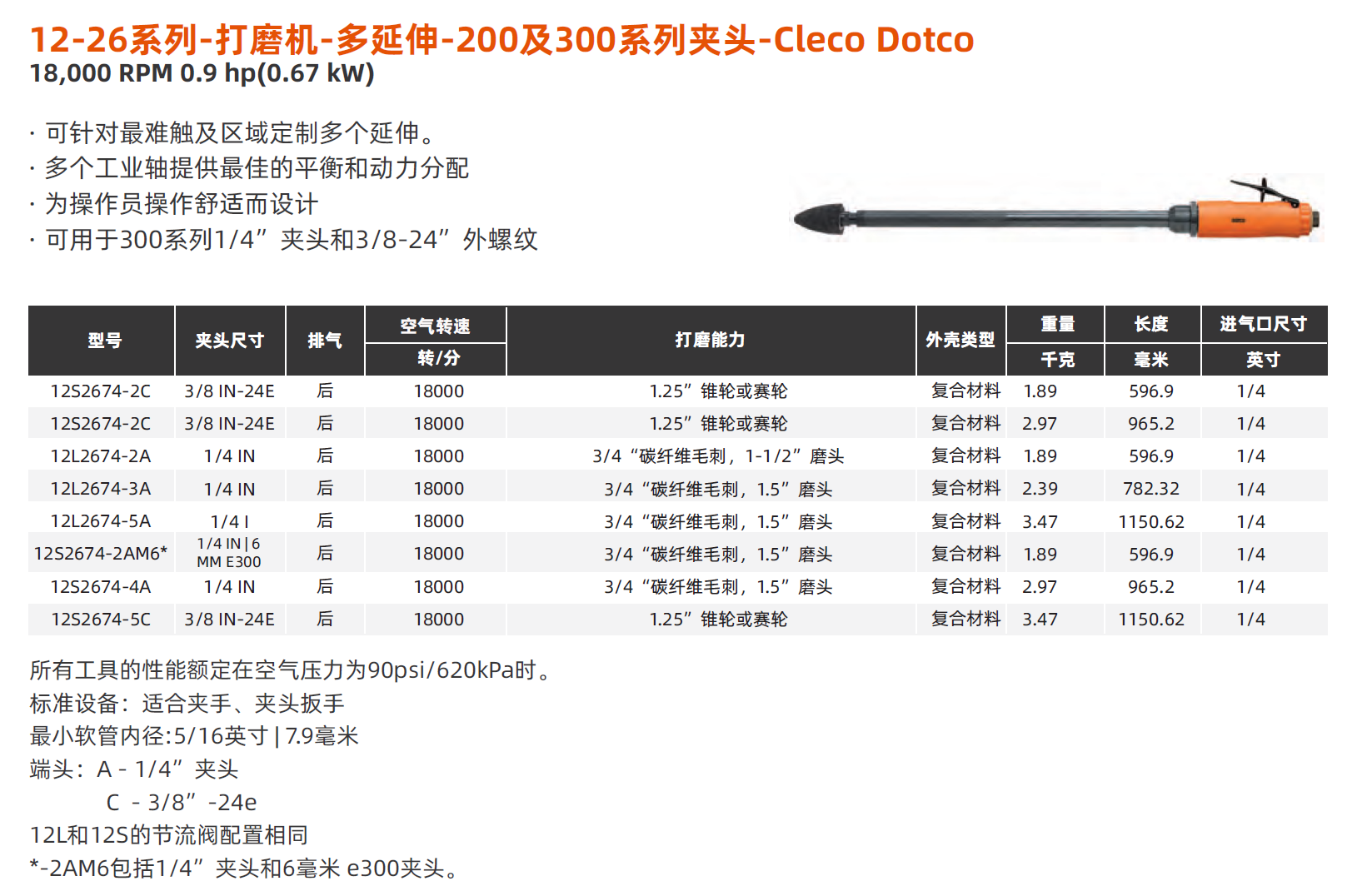 Cleco Dotco打磨机12-26系列型号有12L2682-01;12L2602-01;12L2600-01;12L2680-01;12L2674-2A;12L2674-3A;12L2674-5A;12S2674-2AM6;12S2674-2C;12S2674-4A;12S2674-4C;12S2674-5C等.· 125毫米延伸外壳,用于难触及区域· 可提供多种速度· 平衡舒适,减少疲劳
